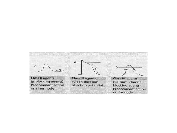 • The Class I drugs are subdivide on the basis of their effects on action potential duration. Class IA drug: Quinidine, Procainamide Disopyramide Class IB drug Lidocaine Mexiletine Tocainide Class IC drug Flecainide Propafenone