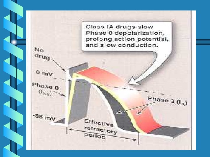 Antiarrhythmic Drugs • Class 1 : Na+ channel blockers • Local anaesthetic effect • -ve inotropic action • Class 1( A ): prolongs duration of action potential & refractory period. • Have K+ channel blocking effect • Antimuscarinic & hypotensive effects.