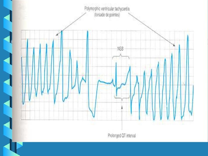 Adverse effects • 1 - Cardiac effects • A) Due to antimuscarinic effect , in A. F. or A. F. may precipitate ventricular tachycardia • B) Syncope • C)Torsade de pointes • D) Cardiac stand still (asystole) in patients with sick sinus syndrome.