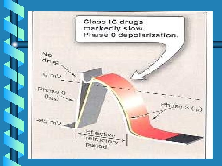 Class 1(c) • Flecainide No effect on the duration of A. P. & R. P. • Proarrhythmic • Approved for refractory ventricular arrhythmias.