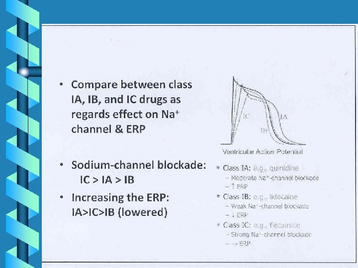 Class 1(A) Quinidine: • Cinchona plant • Block open & inactivated sodium channel • Block potassium channel • -ve inotropic effect • Antimuscarinic effect • duration of action potential & refractory periods of atrium & ventricles. • Hypotensive