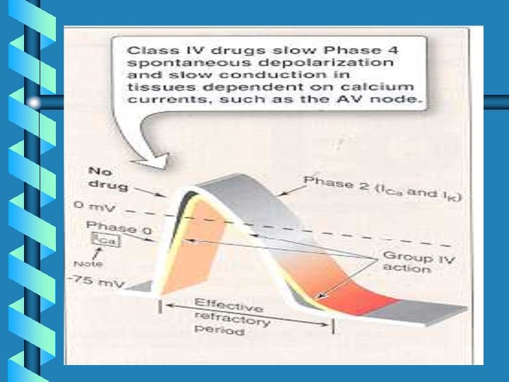 Class 1 V • Calcium channel blockers • e. g. Verapamil, Diltiazem • Their main site of action is A. V. N & S. A. N. • Effective only in atrial arrhythmias
