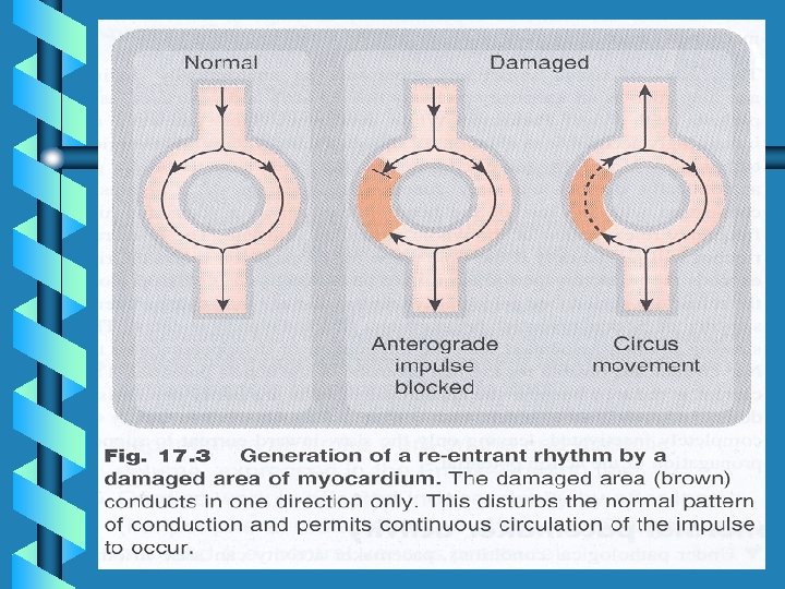 2 - Disturbances in impulse conduction • • May result from block ( nodal block or bundle branch block. Reentry : circus movement In which one impulse reenters and excites areas of the heart more than ones. Some forms of reentry are anatomical in shape as in Wolff. Parkinson –White syndrome.