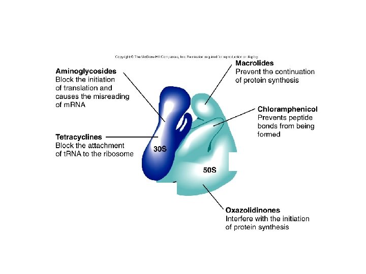 • Bind 50 S subunit • Chloramphenicol – – Produced by Streptomyces Very simple chemical structure and inexpensive Broad spectrum Serious toxicity issues