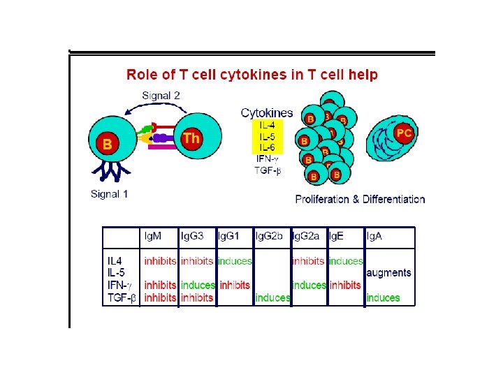 B cell activation • Depending on nature of ag , proceeds by two different routes: • 1 -Dependent upon Th cells(TD) • 2 -Independent of Th cells (TI) • B cell response to TD ags requires direct contact with Th cells, not simply exposure to Th derived cytokines.