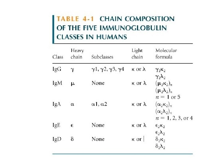Immunoglobulin G (Ig. G) • • The most abundant class in serum ~80% of the total serum immunoglobulins. Ig. G is found also in the interstitial spaces. The Ig. G molecule consists of two λ H-chains and two κ or two λ L-chains. In both mouse and man there are four subclasses of Ig. G fixes complement Ig. G is the only immunoglobulin to cross the placenta. Ig. G reacts with Fc. R’s on phagocytic cells to promote opsonization.