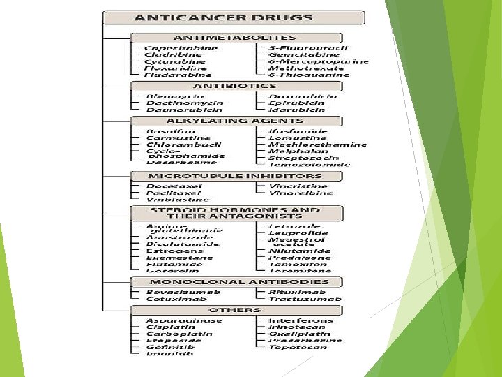 Classifications of anticancer drugs 1 - Cytotoxic Drugs a- Antimetabolites b- Antibiotics c- Alkylating Agents d- Microtubule Inhibitors 2 - Steroid , Hormones and their Antagonists. 3 - Targets drugs 4 - others