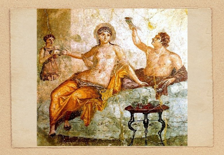 Pasto principale degli antichi Romani Il pasto principale era costituito da vari tipi di carne p. e. : carne di suini. La mammella (Euter) e l‘utero (Gebärmutter) di giovane scrofe erano considerate come una delicatessa. Oltre la carne di suini venivano cucinati anche conigli, oche, anatre, pesce ecc. Spesso i pasti venivano aromatizzati con una selza fatta di pesce ammuffato chiamata ”garum”. Come dessert venivano servite uve, fichi, datteri, melograni, mele, albicocche e cozze.