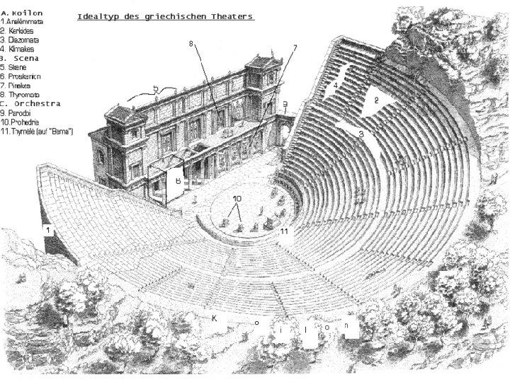 l Skéné – zadní budova, odchod z jeviště, technické zázemí, dům, před nímž se vše odehrává l Proskénion – nižší sál před skéné l Orchéstra - - kruhový prostor mezi skéné a hledištěm (theatron), určený zřejmě zpěvu a tanci chóru, uprostřed ní oltář (thymelé) l Logeion – prostor na střeše proskénia, v helénské a římské době hlavní místo herecké hry