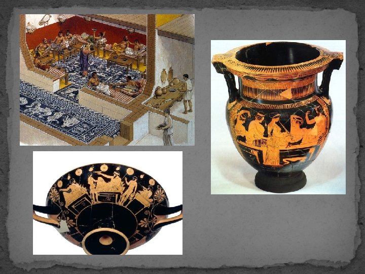 Symposion - „společnost pijáků“ - důvody pro symposia mohly být různé - úspěch v atletické nebo jiné soutěži, narozeniny, náboženské oslavy, atd. - pozvání byla velmi neformální - pozvaný mohl sebou přivést i někoho dalšího - mohlo se konat dvojím způsobem - členové sdružení se dohodli, že se budou střídat v pořádání, přičemž každý přinese svůj díl pití a jídla - eranos - hostinu uspořádal hostitel na vlastní náklady - průběh celého večera měl ustálený pořádek - po příchodu se pozvaný zul a sluha mu omyl nohy a byl uveden do hodovní síně - andrón - zde hostitel mohl určit návštěvníkovi místo - lehátko - kliné - na jednom mohli být dva i tři lidé