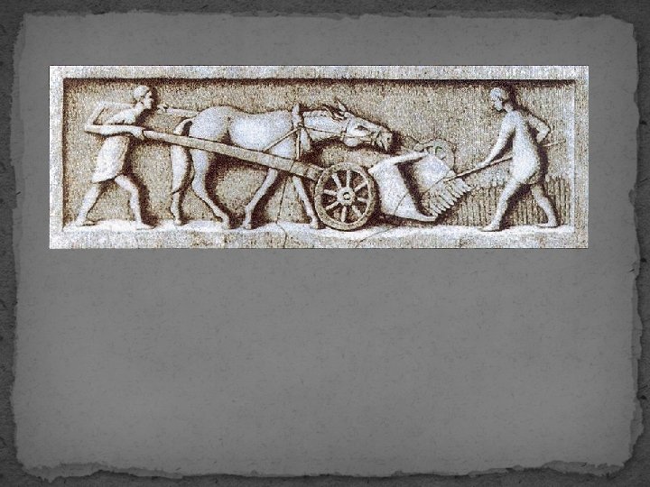 - půda byla stejně jako u Řeků obdělávána jednoduchým pluhem aratrum, taženým hovězím dobytkem - těžká půda byla orána až 4 x do roka - používány byly i motyky a krumpáče - objevují se vynálezy usnadňující práci - galský žací stroj - umožňoval rychle „obrat“ obilné klasy - známo bylo hnojení - chlévská mrva, minerální hnojiva - při obdělávání bylo používán systém střídání plodin namísto nechání pole ladem