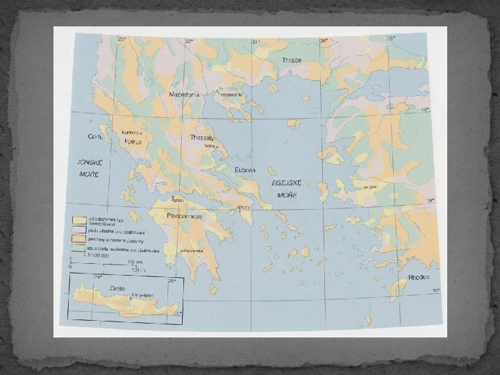 Zemědělství Řecko: - charakter zemědělství i možnosti obdělávání půdy je dán přírodními podmínkami - klima podobné dnešnímu - cca 80% řecké krajiny tvoří hory => soustředění zemědělské produkce do nížin a plání (Thessalie, Boiótie) - zemědělství bylo základním hospodářským odvětvím => věnovali se mu jak lidé z měst, tak lidé na vesnicích a malých usedlostech