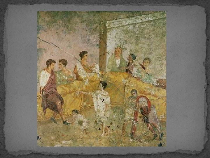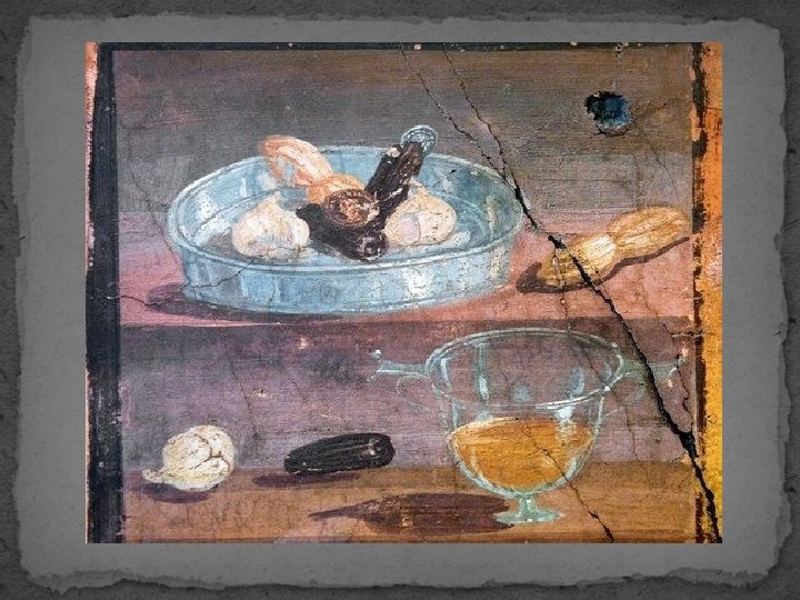 Římská strava - skladba římské stravy se v průběhu času měnila - z počátku byla římská strava prostá - jedlo se to, co si sami Římané vypěstovali - nejobvyklejším jídlem byla kaše nebo řidší těsto vyrobené ze špaldy; nebo polenta - podobné jídlo vyrobené z praženého ječmene -> jako strava se udrželo později - zelenina, luštěniny a sýr - maso jen zřídka - s rostoucí římskou říší se měnil i jídelníček => bylo využíváno vše, co mohla říše nabídnout - jídlo z obilnin - základem byl chléb - dělaný doma, od pekaře - 9 druhů - nejlepší: bílý; nejméně kvalitní: černý (z černé mouky s otrubami); kyprý chléb: zadělávaný mlékem a vejci - mnoho druhů koláčů s různými náplněmi - rozinky, ořechy, mandle - jemné pečivo - cukroví, „piškoty“