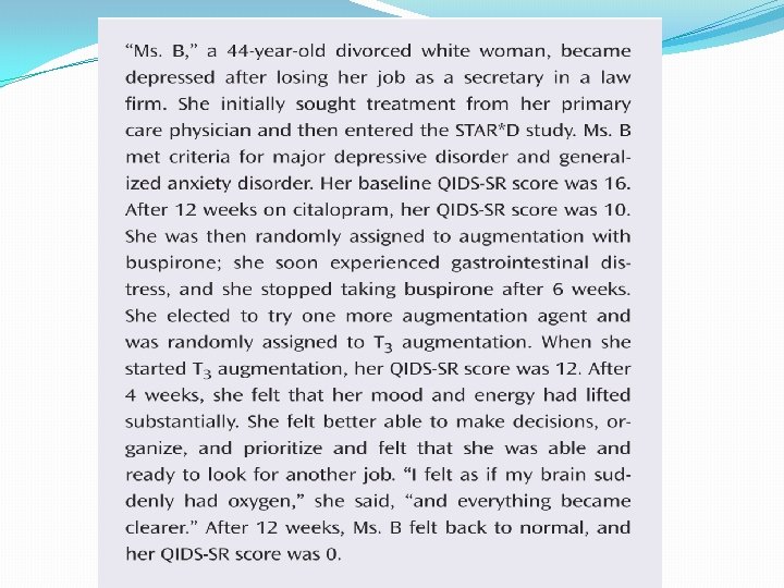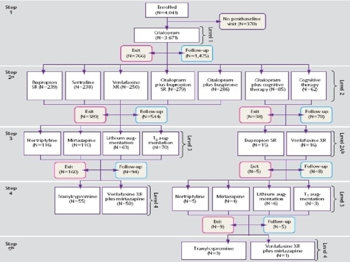 Treatment algorithm: plan A �Escitalopram. 2. 5 mg rising to 20 mg. � Similar to Level 1 in STAR*D � 2 nd for efficacy in Lancet meta-analysis � 1 st for acceptability in Lancet meta-analysis � Mild sex side-effects � Trial should last at least 2 months. � Possible disadvantage if suicide risk high (BMJ)