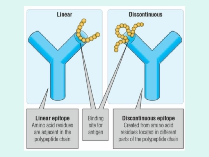 Types of Epitopes 1. Linear epitopes ♣ continuous and found in polysaccharides as well as in both native (nondenatured) and denatured proteins, especially fibrillar proteins. ♣ specificity depends upon primary sequence. ♣ typical size is 5 -6 subunits in length.