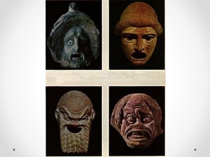 The Actors o Behind the orchestra was a platform where o The actors spoke their lines from behind huge masks. o To aid in viewing, actors wore oversized, wellpadded costumes, and boots with raised soles (stilts). o These masks had exaggerated mouthpieces that amplified the actors’ voices. Chanting also help to amplify their voices. o Many masks were stylized into familiar character types that were easily recognized by the audience.