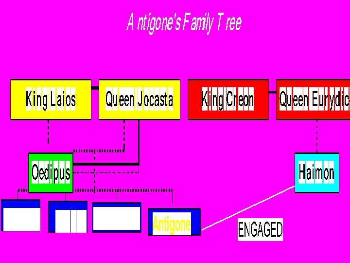 V. The Oedipus Trilogy • At Thebes, he conquered the Sphinx who was terrorizing the city. The sphinx was a terrible monster with wings of an eagle, body of a lion, and head of a woman. By answering the Sphinx’s riddle correctly, he defeated the monster and gained the throne of Thebes. Now he was the new king and the old king’s widow became Oedipus’ queen. • Oedipus and Jocasta had four children together…. two sons, Polyneices and Eteocles; and two daugthers, Antigone and Ismene.