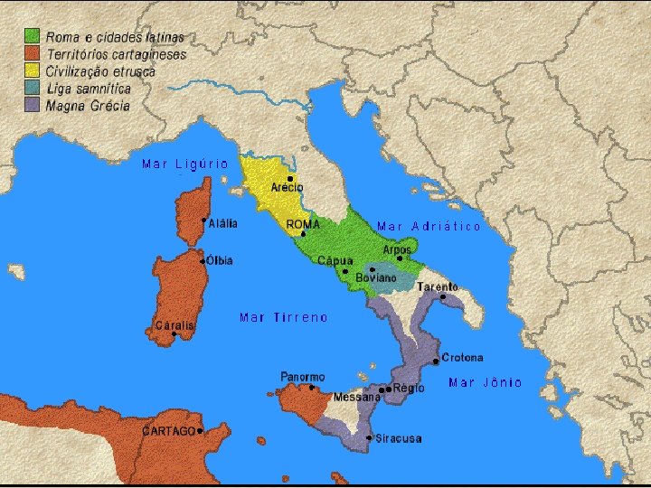 GUERRAS PÚNICAS ü ROMA ü Disputa X CARTAGO; pela Sicília e pelo comércio no Mar Mediterrâneo; Oriente: Macedônia, Síria, Grécia e Egito; Ocidente: Península Ibérica e Gália.