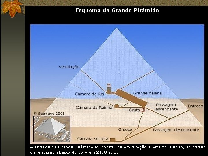 Será coincidência? . . . • Que altura da Pirâmide de Quéops, multiplicada por um milhão, corresponda a aproximadamente à distância Terra-Sol, isto é, a 146. 600. 000 km. . . • Que o meridiano que passa pelo centro da pirâmide divida continentes e oceanos em duas metades exatamente iguais. . . • Que o Perímetro da pirâmide, dividido pelo dobro de sua altura, tenha como resultado o famoso número Pi. . . • Que a orientação da pirâmide permitia que os raios luminosos da estrela Sírios, ao passar pelo meridiano, penetram na câmara do núcleo da pirâmide por meio de um conduto, no momento em que se anunciava o princípio do ano egípcio e o inicio das inundações, como a luz da estrela Polar entrava pelos condutos do norte. . . • Que todos os quatro lados tenham praticamente o mesmo comprimento, com uma exatidão não existente apenas por alguns centímetros. . .
