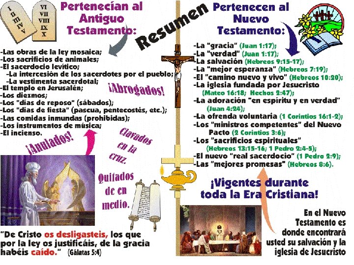 ANTIGUO Y NUEVO TESTAMENTO ANTIGUO TESTAMENTO • Se cae de la gracia. Gal. 5: 4. • Es estar en esclavitud. Gal. 5: 1. • Es estar en pecado. Rom. 5: 14. NUEVO TESTAMENTO • Estamos en la gracia. Rom. 6: 14. • Es estar libre. Gal. 5: 1. • Somos libres del pecado. Rom. 6: 18. CONCLUSIÓN: • Hay dos pactos uno esta en vigencia (El Nuevo Testamento). El otro fue anulado. (El Antiguo Testamento). • Ya no estamos bajo la ley de Moisés, sino bajo la ley de Cristo. • Obedezcamos a Dios y no a los hombres.