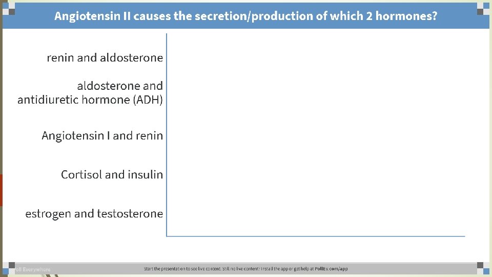 Angiotensin II causes the secretion/production of which 2 hormones? a. Renin and aldosterone b. Aldosterone and ADH c. Angiotensin I and renin d. Cortisol and insulin e. Estrogen and testosterone