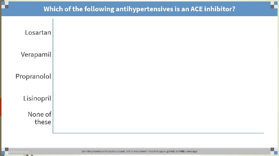 ACE Inhibitors� Side effects � Hypotension � Dry cough � others include loss of taste, rash, jaundice, hyperkalemia, renal damage � Examples: all end in –pril � enalapril (Vasotec) � captopril (Capoten � lisinopril (Zestril) � quinapril (Accupril) � ramipril (Altace) � moexepril (Univasc) � fosinopril (Monopril) � renzapril (Lotensin