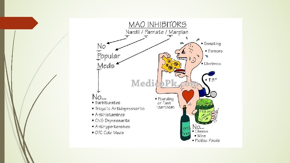 MAO Inhibitors � Treats depression when other drug classes are ineffective Adverse effects: Orthostatic hypertension, headache, insomnia, diarrhea Drug-drug and Drug-Food interactions! -Hypertensive crisis w/other antidepressants (life-threatening “serotonin syndrome”) -Hypertensive crisis w/sympathomimetics -Hypertensive crisis w/food containing tyramine (avocados, bananas, cheese, raisins, beer and wine, liver, salami, hot dogs, sausage, soy sauce, others) can lead to MI and CVA