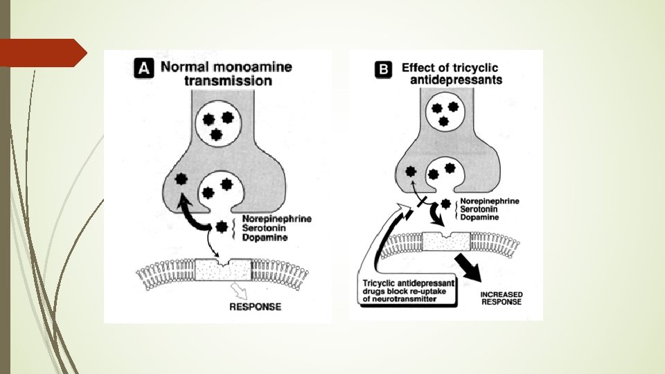 Antidepressants THEORY of Mechanism of Action: work by increasing the concentration of neurotransmitters (serotonin, norepinephrine, and/or dopamine) in CNS synapses Monoamine oxidase inhibitors (MAOIs) Tricyclic antidepressants (TCAs) Selective serotonin reuptake inhibitors (SSRIs) Atypicals
