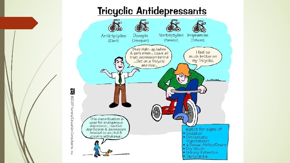 Tricyclic antidepressants �Less dangerous and have fewer adverse reactions than MAOIs �Adverse Reactions: �Orthostatic hypotension �Cardiac dysrhythmias (rare) �Sedation on initial treatments �Anticholinergic effects (dry mouth, blurred vision, etc. ) �Drug-Drug: Do not administer with MAOIs � Special considerations: may unmask mania, narrow therapeutic index