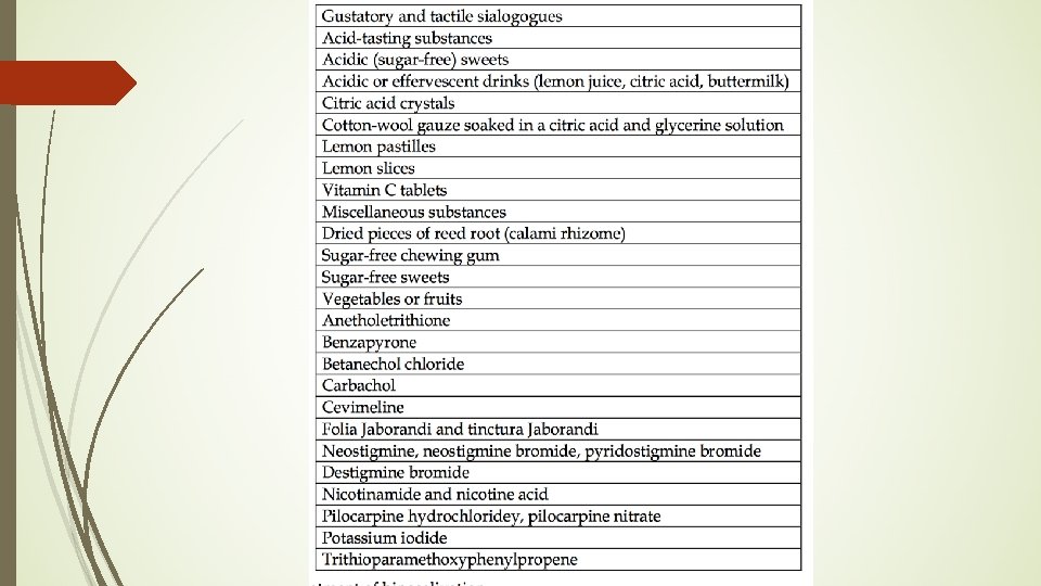 Treatments for Hyposalivation Pilocarpine, which stimulates muscarinic cholinergic receptors Salivary replacement therapies, as well as use of salivary, masticatory and pharmacological stimulants.