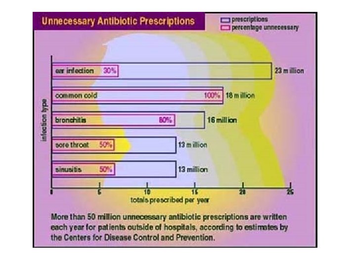 Inappropriate Antimicrobial Use • Lack of quality control in manufacture or outdated antimicrobial • Inadequate surveillance or defective susceptibility assays • Poverty or war • Use of antibiotics in foods