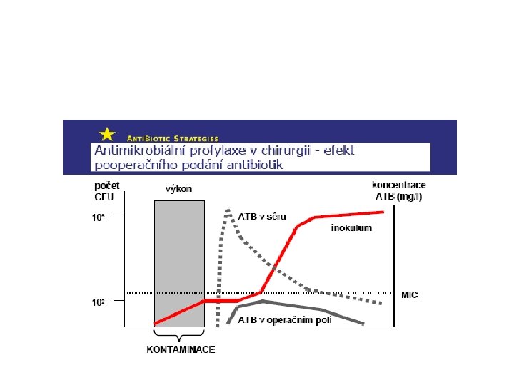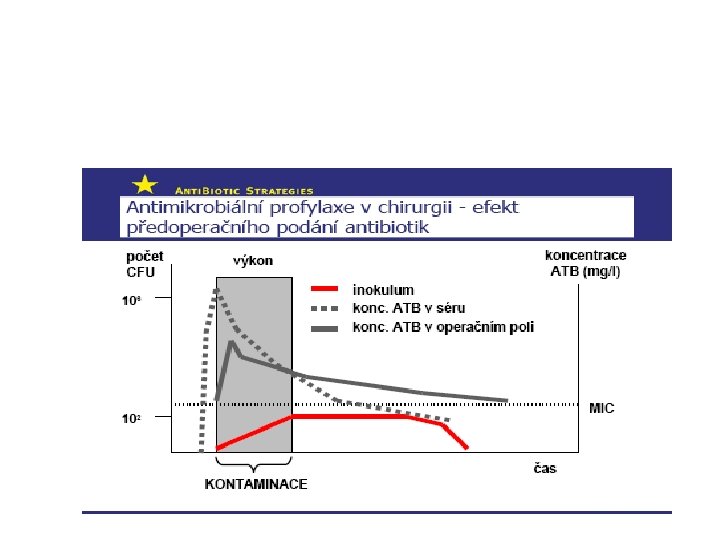 Cíl a princip předoperační profylaxe (PAP) • Cíl PAP: snížení rizika vzniku infekce v důsledku mikrobiální kontaminace operačního pole • Princip PAP: zajištění účinné baktericidní koncentrace ATB s optimálním spektrem v operačním poli od počátku, po celou dobu trvání chirurgického výkonu • Podmínky účinné PAP: Intravenosní podání dostatečné dávky vhodného ATB s baktericidním účinkem před počátkem chirurgického výkonu