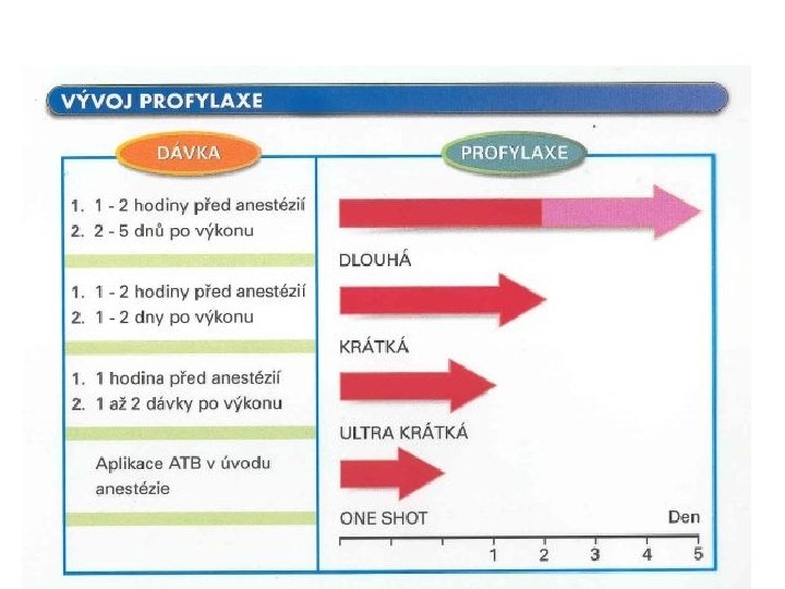 Zásady správné profylaxe • Profylaxe není terapie, jde o chráněné koagulum • Nepřekračovat bez příčiny povolenou dobu podání profylaxe (dnes jedna dávka) • Při delších chirurgických výkonech a větších ztrátách krve správné načasování dalších dávek (biologický poločas) • Pozor na váhu pacienta - adekvátní dávkování • Nejčastější chyby v profylaxi jsou poddávkování a překračování povolené doby profylaxe (selekce rezistentních kolonií) • Antibiotika představují obrovský selekční tlak • Platí čím méně, tím lépe (v profylaxi dnes jedna dávka!!!)