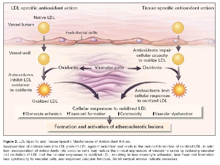 PAPEL DE ANTIOXIDANTES EN ESTE PROCESO Se ha encontrado que el uso de antioxidantes orales disminuye la velocidad de progreso e inclusive la regresión de la lesión. Aumentando el contenido de vitamina E en LDL se reduce la incidencia de Ruptura de placa ateromatosa Adhesión plaquetaria Vasoespasmo El uso combinado de antioxidantes orales y disminución de lípidos dieta, tiene mayor efecto en detener el avance de la lesión.