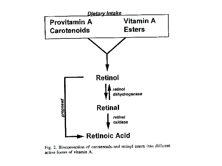 VITAMINA A Vitamina liposoluble, poderoso antioxidante por atrapar radicales peroxilo (ROOº). Es mas eficiente que la vitamina E en las membranas, pero no en solución probablemente debido a que la vitamina A no posee un extremo polar. En sistemas in vitro se ha encontrado que la actividad antioxidante de vitamina A es: Retinol > retinal >> retinil palmitato > Ac. retinoico