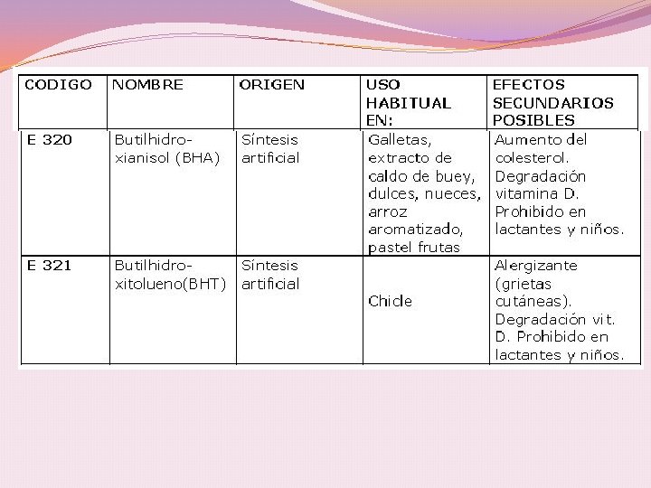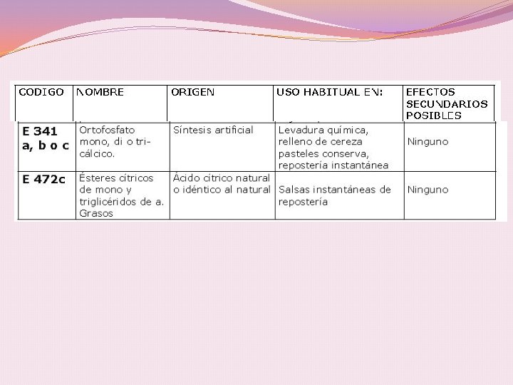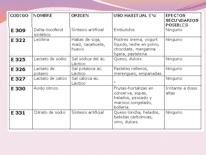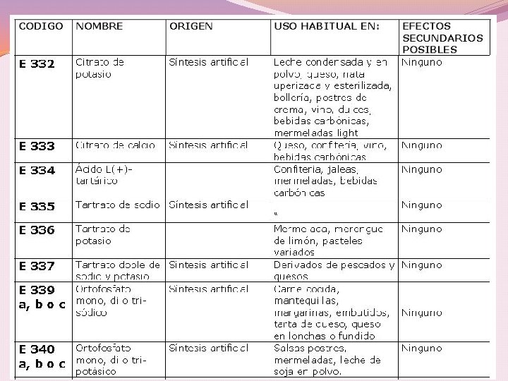 RIESGO TOXICOLÓGICO Aditivo Problemas tóxicos E 302 Puede originar cálculo renal a personas con tendencias E 310, 311 y 312 Podría ser carcinógeno E 320 y 321 Alergizantes, se acumulan en el organismo, promotores de cáncer de hígado, daño renal. El E 321 produce daños en el desarrollo infantil prohibido en muchos países incluyendo México. E 330, 331, 332, 333 Pueden provocar edemas y urticaria, provocan caries y úlceras y 380 en la mucosa oral, el E 330 tiene tendencias carcinógenas E 338, 339, 340 y 341 En cantidades elevadas puede producir osteoporosis en los niños, provoca alteraciones renales y cálculo, el E 338 tiene tendencias carcinógenas E 385 Potente secuestrador de metales, potente carcinógeno. E 385 Etileno Diamino Tetracetato Cálcico Disódico, a pesar de su grado alto de afección al organismo, es utilizado para tratar intoxicaciones por metales pesados.