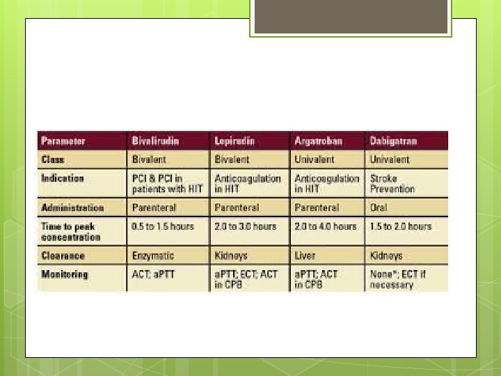 HIT diagnosis & management Anti PF-4/heparin antibody Platelet activating Ig. G Abs. Manage by stop all heparin § § Alternative use of Lepirudin, Argatroban, Bivalirudin, Fondaparinux Not to give platelet transfusion Search for thrombosis (DVT) Don’t give warfarin till platelet count reaches baseline level.