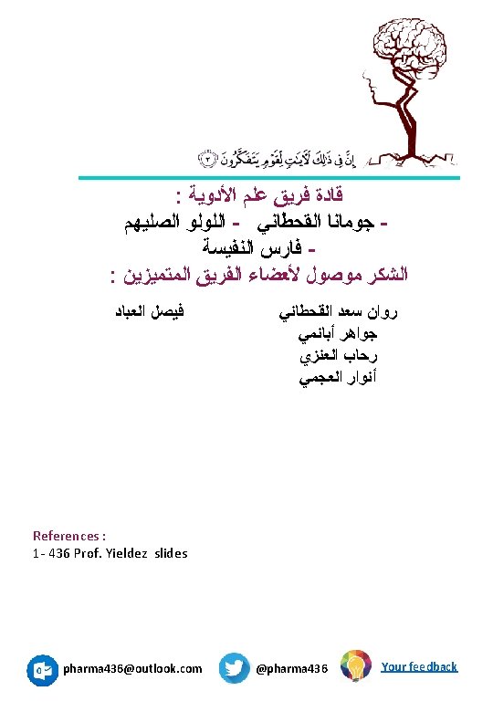 ﺍﺗﻜﻠﻮﺍ ﺑﺎﻟﺪﻳﻦ Ticlopidine ﺻﺎﺭ ﻛﻠﻮ ﺑﺪﻭ ﻗﻴﺮﻝ Clopidogrel Better! These drugs specifically and irreversibly inhibit ADP receptor of subtype P 2 Y 12*, which is required for platelets activation thus prevent platelet aggregation. * P 2 Y 12 is purinergic receptor and is a chemoreceptor for adenosine diphosphate (ADP). Secondary prevention of ischemic complications after myocardial infarction, ischemic stroke and unstable angina. • • Drug Interactions P. K Bye to you (P 2 Y) ﻧﻘﻮﻝ ﺍﻷﺪﺏ ﻣﻦ Use are given orally. have slow onset of action (3 - 5 days). pro-drugs, they have to be activated in the liver. bound to plasma proteins • • ADRs M. O. A Drug ADP pathway inhibitors ﺍﻟﺪﻳﻦ ﻛﻠﻪ ﺃﺪﺏ ﺍﻟﺒﻨﺖ ﺣﻼﻫﺎ ﺑﺎﻷﺪﺏ (ADP= dine) (ADP= Grel/Girl) Sever neutropenia, CBC should be done monthly during treatment. ﻭﺳﻄﻲ ﺩﻳﻨﻨﺎ ﻷﻦ ، ﺑﺎﻟﺪﻳﻦ ﺍﺗﻜﻠﻮﺍ Bleeding ( prolong bleeding time ). (neutralize = neutropenia) Worse with ticlopidine G. I. T : nausea, dyspepsia, diarrhea. (ticlopidine) Allergic reactions. inhibit CYT P 450 causing increased plasma levels of drugs such as phenytoin and carbamazepine. Notes • • can’t be taken with food • • Why clopidogril had replaced • ticlopidine? Indication • is more potent than ticlopidine Longer duration of action than ticlopidine Less frequency of administration (given once daily ). Less side effects (less neutropenia). Bioavailability is unaffected by food. Clopidogrel has replaced ticlopidine For patients with a history of recent myocardial infarction (MI), recent stroke, or established peripheral ﻛﻠﻬﺎ ﺯﻱ ﺑﻌﺾ ﺍﻻ arterial disease. ﺍﻻﺳﺒﻴﺮﻳﻦ ﺑﺮﻭﻓﻴﻼﻛﺴﺲ • For patients with acute coronary syndrome (unstable angina/ MI): either those managed medically or with percutaneous coronary intervention* (PCI) with or without stent. • *Coronary angioplasty (percutaneous coronary intervention, PCI) is a procedure used to open clogged heart arteries. Angioplasty involves temporarily inserting and inflating a tiny balloon to help widen the artery.