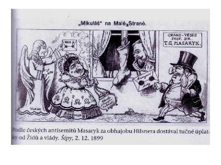 Jan Neruda (1834 -1891) „Co se mé osobností dotýče, k nenávisti k židům nemohu se právě tak přiznat, jako se musím přiznat k politickému a národnímu, ale mužnému nepřátelství k nim…. . A punto dovedu u dat, kdy nepřátelství to počalo, bylo to, když jsem úplně poznal nesmiřitelně jizlivý, hluboký jich a činný antagonismus proti naší národnosti české a veškerým našim snahám národním a politickým……. …. . Jsou a zůstanou bodákem vraženým do našeho masa. Nemůžeme obžalovat bodák ten; avšak nikdo se nemůže divit, vzkřikneme-li při bolesti, kterou nám způsobuje, a pozorujeme-li se strachem, jak po každém léčitelském pokusu hnisání dále se šíří…. . “ (na titulní straně Národních listů v červnu roku 1869. ) Nerudův antisemitismus se projevuje i v dalších jeho dílech Malostranské povídky, cestopis z návštěvy Palestiny, výběr fejetonů Studie krátké a kratší (obsahuje např. fejeton Pro strach židovský)