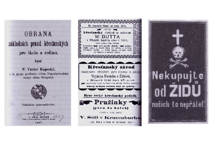 • Židé původci moru „černé smrti“ Ve 14. století Evropu ničily epidemie plicního moru, vyhladili téměř polovinu populace. Kolovaly pověsti, že nemoc zavinili židé úmyslně tím, že otrávili studny. Stovky židovských obcí byly vypáleny • Rituální vraždy Židé byli obviňováni z pořádání rituálních obřadů, přii kterých docházelo k mučení křesťanů(zejména dětí) a k pití jejich krve • Znesvěcování hostií Německý dřevoryt z 15. st. , na kterém je zobrazeno „znesvěcování hostií“. Na první desce jsou hostie kradeny, na druhé krvácejí, zatímco je Žid probodává, na třetí jsou Židé zatýkáni a vězněni, na čtvrté zaživa upalováni.