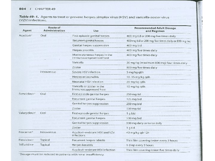 PK of Acyclovir : –is available as oral (15 -20%) (not affected by food), topical and i. v. –Does it have high or low oral bioavailability? –Short t 1 l 2 3 hr (thus given 4 -5 times daily) and eliminated mainly by kidney (t 1 l 2 prolonged in renal impairment) t 1 l 2 20 hr. , –Distribute in ALL parts of the body including CNS (e. g: encephalitis). –What is Valacyclovir? . –What is the meaning of a prodrug? Clinical Uses (see Table 49 -1) HSV, Varicella-zoster VZV; Epstein-Barr virus mediated infection; HSV encephalitis; Genital herpes infection.