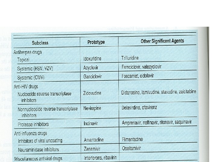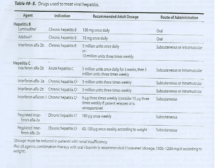 • IV. Antihepatitis Agents: • Like in AIDS, they are suppressive rather than curative. Among many hepatitis viruses, HBV and HCV are the most common cause of chronic hepatitis, cirrhosis, and HCC. • Drugs for Hepatitis B (see Table ) – Lamivudine: – MOA: inhibit HBV DNA polymerase and HIV reverse transcriptase, resulting in chain termination. • This safest NRTI antiretroviral drug, shows prolonged intracellular t 1/2 in HBV cell lines (17 -19 Hr), than in HIVinfected cell line. So What? . Effectiveness: Achieves almost universal HBV DNA suppression, with decrease in viral replication; and decrease progression to liver fibrosis. Response is more rapid than using interferon alone.