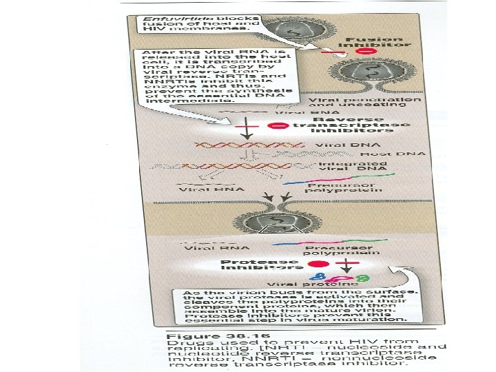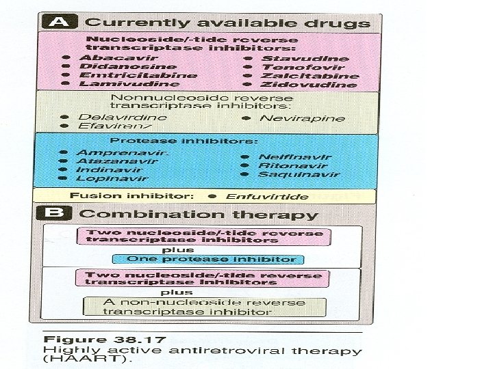• III. Drugs Used for Rx of AIDS (Antiretroviral Agents) – AIDS are caused by HIV, and zidovudine was the first drug used (1987). – To understand drugs used for AIDS, the life cycle of HIV should be utilized for drugs combination (See Figure 38 -16) – Drug combination or the so-called Highly Active Antiretriviral Therapy (HAART) (Figure 38 -17) as well as adherence to the regimen, both are very essential. Classification of Anti AIDS (Based on life cycle) Table 2 and Figure 38 -17): 1) Nucleotide Reverse Transcriptase Inhibitors (NRTIS) e. g. ; 2) Non Nucleotide Reverse Transcriptase Inhibitors (NNRTIS) e. g. ; 3) Protease Inhibitors e. g. Saquinavir; Ritonavir; Indinavir 4) Viral Fusion Inhibitor e. g. Enfuvirtide