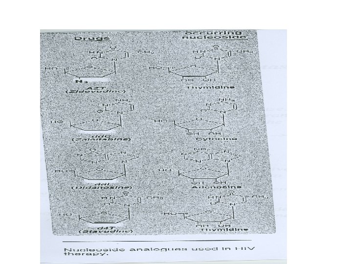 • Didanosine (dideoxyinosine) With out the two hydroxyl group. – Differ from Zidovudine: • Low oral bioavailability and destroy by acid (given before meals), but they change to chewable Tablets. • Used for AZT resistance. • Like AZT, Its elimination is dependent on kidney. • However, It is a chelating agent (interaction with tetracyclins and fluroquinoline (Two hour should be given before or after). Side Effects: • Pancreatitis (check serum amylase) increases in alcoholics • Peripheral neuropathy (Dose related); hepatitis, but unlike AZT has no leucopenia. • Optic neuritis • Hyperuricemia Note: should not be combined with AZT! Antagonize each other. • Zalcitabine: – Similar to Didanosine