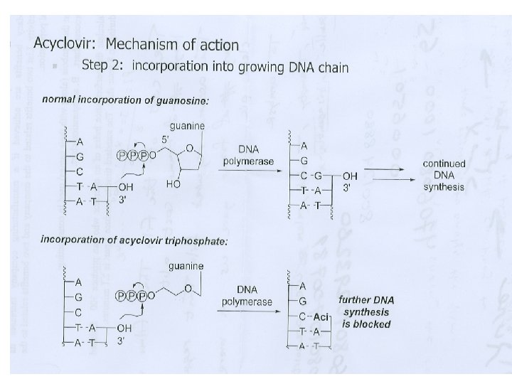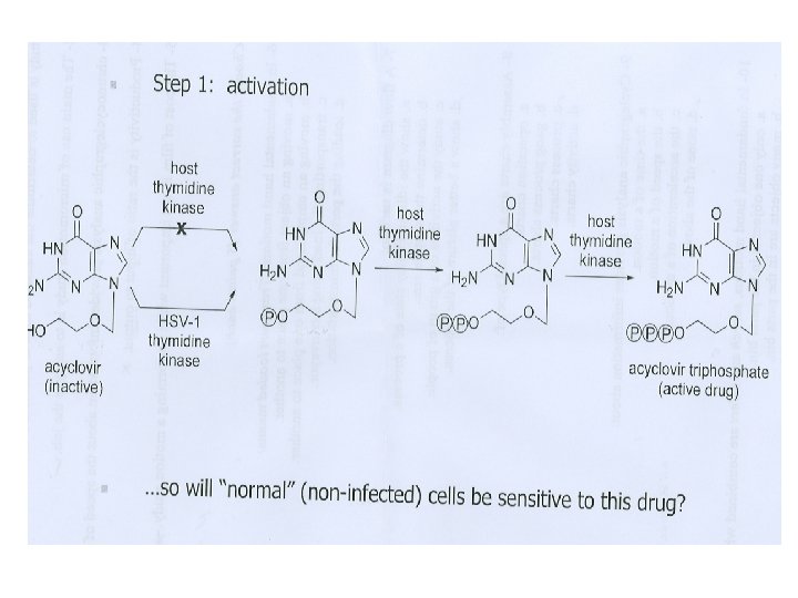 1) Agents to Treat Herpes Simplex virus (HSV) and Varicella Zoster Virus (VZV) infections. • Examples: Acyclovir (prototype); Valcyclovir; Famiciclovir; Trifluridine (Topical) • MOA: (49 -2) They are guanosine analogs without sugar moiety (so what? ). • Three phosphorylation Steps are required for activation (one depends on viral thymidine kinase), forming triphosphate form (1 in the viral 2 on the host). This (acyclo-GTP), will incorporate into viral DNA-causing premature DNA-chain termination (irreversible binding to viral DNA polymerase) and inhibition of DNA snythesis. • What is the effect of drugs on the host cells (not infected)?