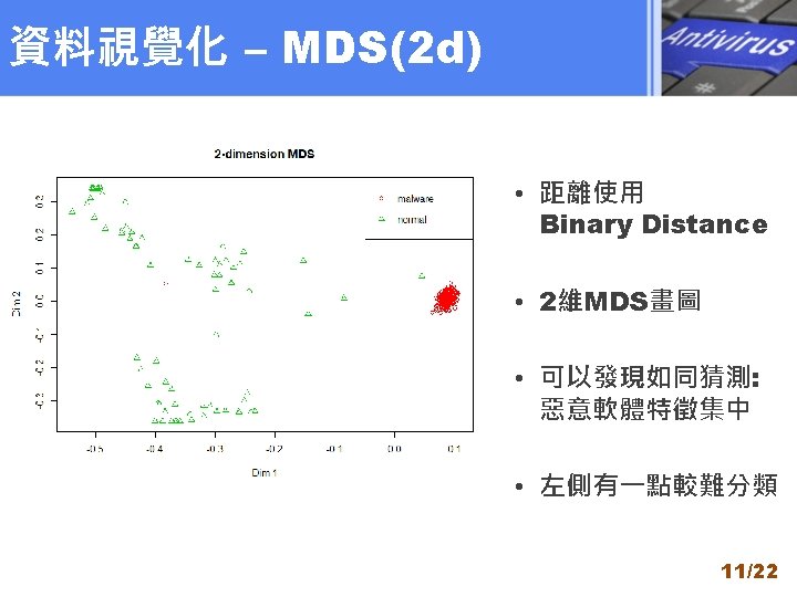 Antivirus Dataset Analysis 710633111 122 Agenda u Antivirus Slides: 22 Download presentation Antivirus Dataset Analysis 710633111 統研一 徐維澤 1/22 Agenda u Antivirus資料集背景介紹 u 初探Antivirus資料集(EDA) u Antivirus資料視覺化(DR) u 維度縮減方法比較 u 結論 2/22 Antivirus資料集背景介紹 3/22 初探資料 - Heat Map (2) 9/22 資料視覺化 – ISOMAP(2 d) • 距離使用 Binary Distance • 2維ISOMAP (k = 10) 12/22 資料視覺化 – ISOMAP(3 d) 14/22 DR比較 - LCMC • LCMC評價 取k = 5~10 • MDS 表現優於 ISOMAP 17/22 DR比較 – 分類法則/ stress • Leave-one-out ISOMAP MDS • 使用C 5. 0分類樹 分類正確率 99. 2% 99. 5% • 正確率均接近 100% Stress 14934 10628 • MDS在分類正確率與Stress 都較ISOMAP佳 18/22 Thank You for Listening! 22/22