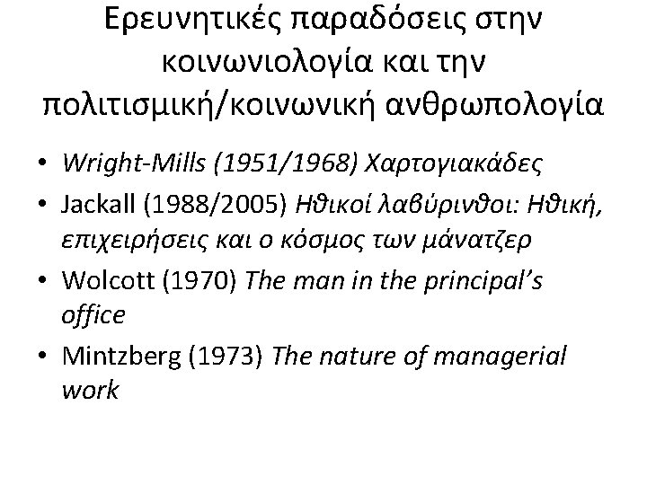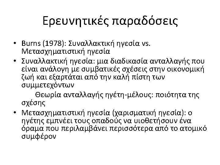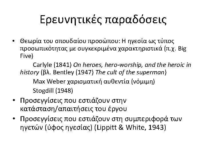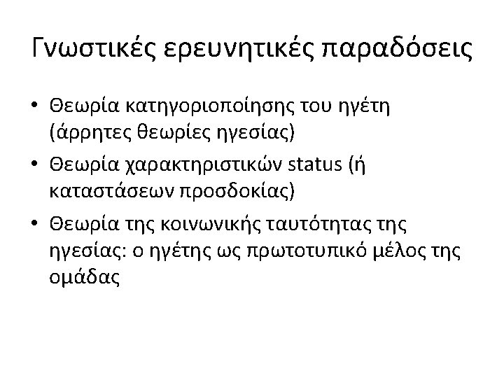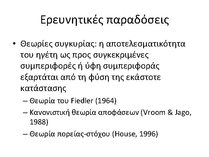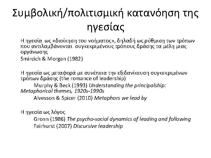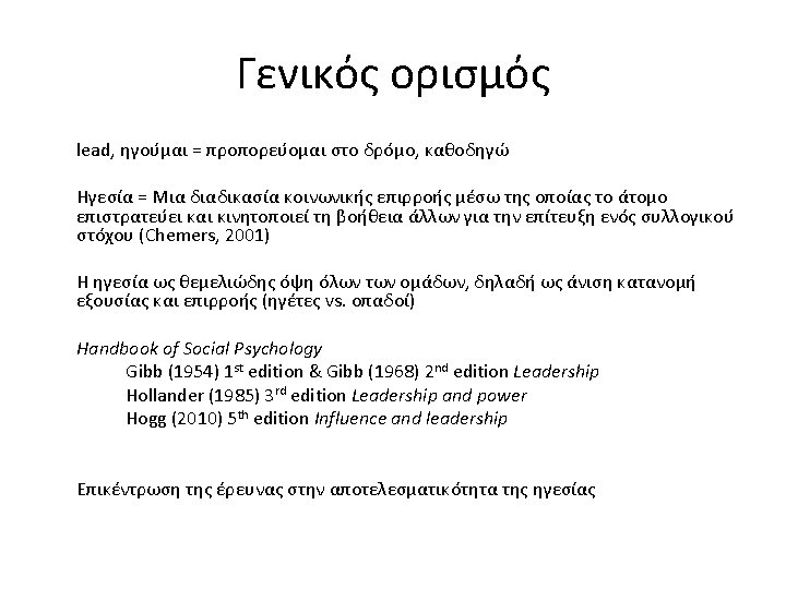 Γενική βιβλιογραφία • • • Antonakis & Day (Eds. ) (2017) The nature of leadership Bass (2008) The Bass handbook of leadership. 4 th ed. Bryman et al (Eds. ) (2011) The Sage handbook of leadership English (Ed. ) (1997) The Sage handbook of educational leadership English (Ed. ) (2011) The Sage handbook of educational leadership. 2 nd ed. Northouse (2019) Ηγεσία Ταμίσογλου (2020) Ηγεσία στην εκπαίδευση Waite & Bogotch (Eds. ) (2017) The Wiley international handbook of educational leadership Yukl (2009) Ηγεσία στους οργανισμούς