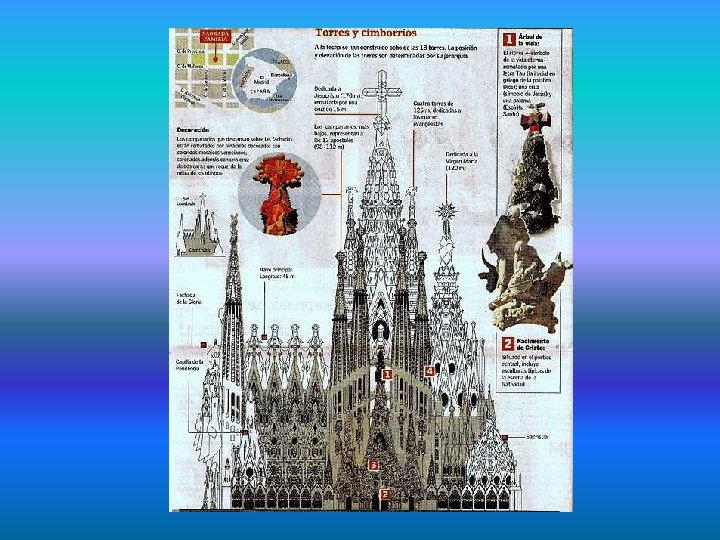 En 1926, cuando murió Gaudí, sólo se había construido una torre. Del proyecto del edificio sólo se conservaban planos y un modelo en yeso que resultó muy dañado durante la Guerra Civil Española. La obra que realizó Gaudí, es decir, la fachada de La Natividad y la cripta, ha sido declarada Patrimonio Cultural de la Humanidad por la Unesco. La Sagrada Familia fue propuesta para ser una de las 7 Maravillas del Mundo. <FACHADA DE LA NATIVIDAD