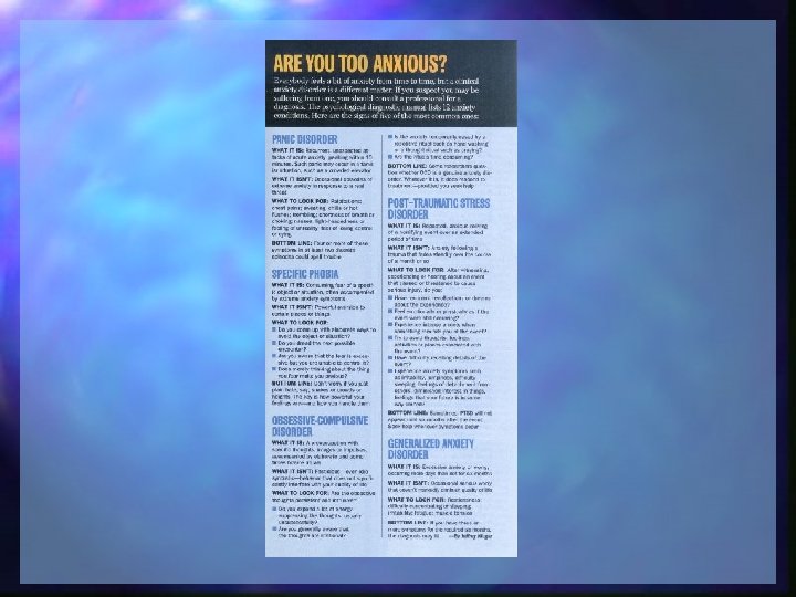 Generalized Anxiety Disorder • Description “Free floating anxiety with no trigger” • Symptoms – – – 1. Excessive worry (health, money, family, work) 2. Insomnia, impatience 3. Sweating 4. Muscle Tension 5. Fatigue