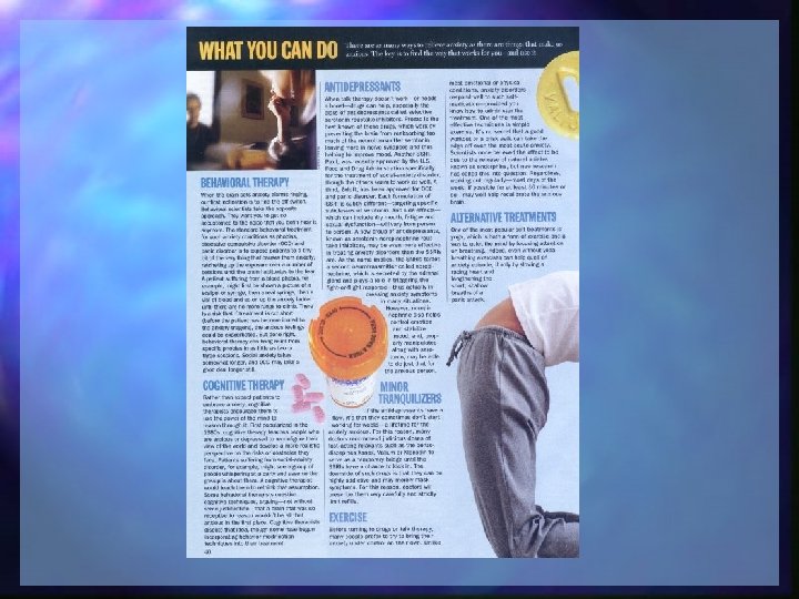 Anxiety Disorder Treatments • Behavior Therapy – 1. systematic desensitization/exposure therapy – 2. response blocking/prevention (OCD) – 3. flooding/implosion • Drugs – yes to antidepressants, no to tranquillizers (valium) • Cognitive – thinking, rumination, worry • Exercise/Progressive Muscle Relaxation/Yoga Next